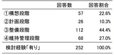 支援制度の検討経験があると回答した自治体 252箇所に対して、検討段階を尋ねた結果を表-2に示す。「構想段階」が 22.6%、「計画段階」が 10.3%、「整備段階」が 44.4%、「維持管理段階」が 27.0%であった。