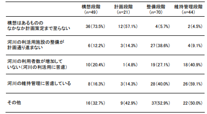 当該課題は、かわまちづくりの成果に直結する部分であり、本質的な課題と言えるが、主に整備段階及び維持管理段階の回答が多い傾向があり、本項では両段階について着目して分析を行う。