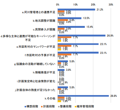 また他の段階や、後述する他の項目と比較し、「河川管理者との連携不足」の割合が高いのも特徴的である。構想段階はそれぞれの主体が取組みを進める初期の段階であり、各主体によるコミュニケーションが必要となる。特に、計画の中心となる自治体担当者と河川利活用の責任者である河川管理者との連携は重要で、連携できていない、または連携できない何か原因が存在・介在した結果が課題として現れている可能性がある。原因の一つとして、自治体側が支援制度や河川区域の利活用について詳しくないことも想定されるが、それらに熟知する河川管理者側から積極的に自治体側に働きかけることも有効と考えられる。