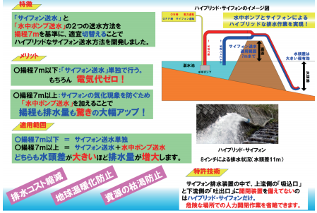 ・高低差のある地形において、起動時に1分~2分間だけ電気を使用して水中ポンプでサイフォン作用を起動するが、起動した後は電源をOFFにして、サイフォンの限界揚程 7mまでは無動力で排水作業を行うサイフォン排水装置
