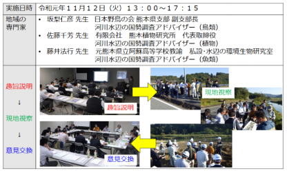 る。地域の専門家として、手引き(案)の評価対象生物群である植物、魚類、鳥類の 3 名の河川水辺の国勢調査アドバイザー等にご協力いただいた。実施は、趣旨説明→現地視察(3 箇所)→意見交換の流れで、午後か